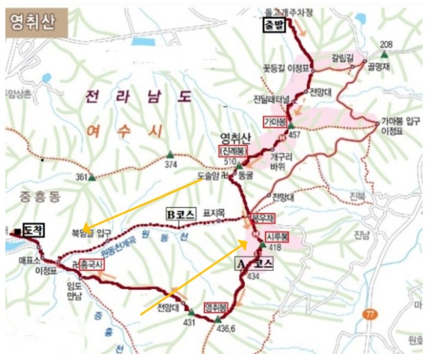 A코스 : 돌고개주차장 ~ 가마봉 ~ 진례봉(정상) ~ 봉우재 ~ 시루봉 ~ 영취봉 ~ 흥국사 ~ 흥국사공영주차장