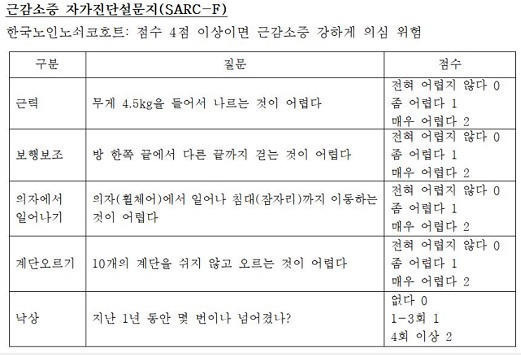 종아리 둘레를 측정했을 때 남자는 34cm, 여자는 33cm 미만, 근감소증 자가 진단 설문지(SARC-F)