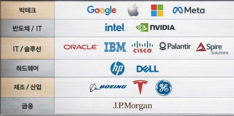 구글, 애플, 마이크로소프트(MS), 메타, 인텔, HP, 오라클, IBM, 델, 엔비디아, 팔란티어,