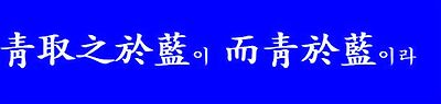 靑取之於藍이 而靑於藍이라. [독음] 청취지어람 이청어람 [출전] 순자(荀子)-<권학편(勸學篇)> [해석]청색은 쪽(남색)에서 취했으나 쪽(남색)보다 푸르다 (제자나 후배가 스승이나 선배보다 나음을 비유적으로 이르는 말) □字義 •靑(푸를 청) 남색은 푸른빛을 띤 자주색이다. •取(취할 취) 조건에 맞는 것을 골라 가지다. •之(갈 지/어조사 지) ‘그것을’ 청(靑)을 가리키는 목적어이다. •於(어조사 어)靑取之於藍 於는 ‘~에서’ 처소격전치사이다. •於(어조사 어)靑於藍 於는 ‘보다’ 비교전치사다. •藍(쪽 람) 진한 푸른빛이다. 쪽풀로 중국에서 염료로 쓰였다. •而(말이을 이) 역접접속사다. ‘그러나’