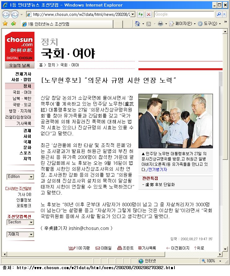 1. 첫번째는 그분이 평소에 보여주신 신념과 행동 그리고 말씀이지요. 다음은 노무현 대통령께서 의문사를 밝혀내야 한다고 주장했던 몇년전의 기사입니다.