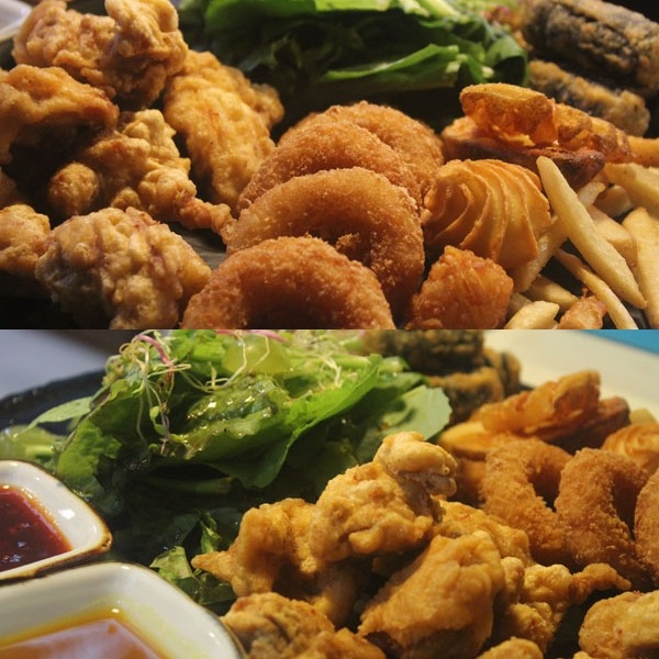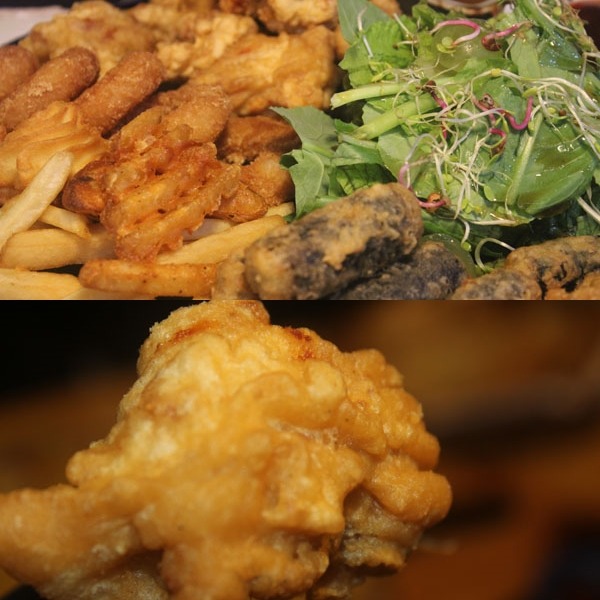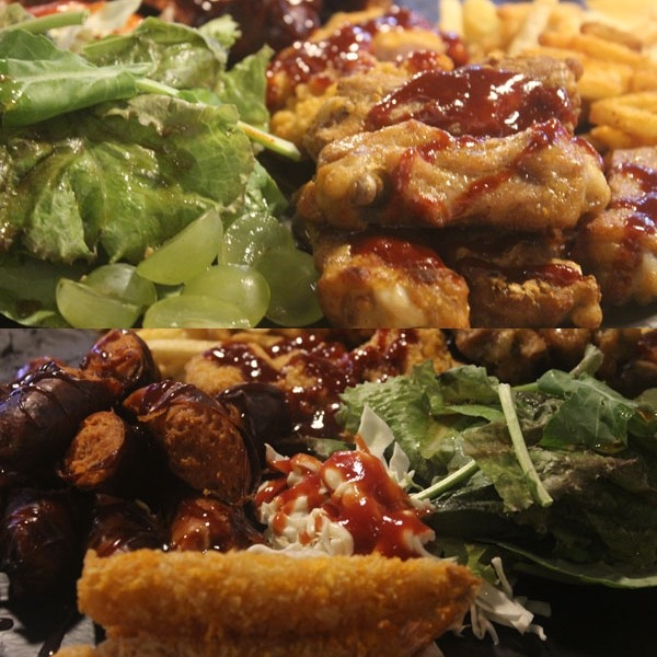 왕수제소세지, 새우튀김, 야채샐러드, 감자튀김,