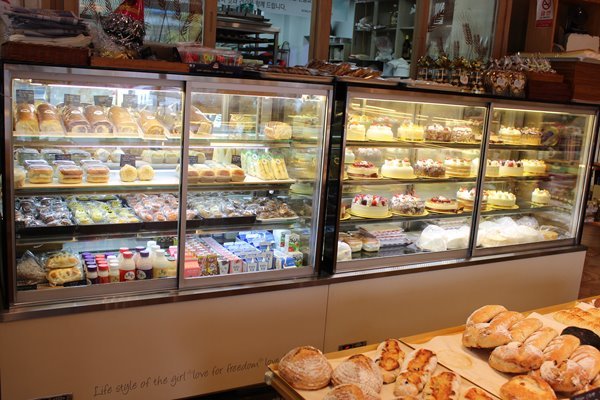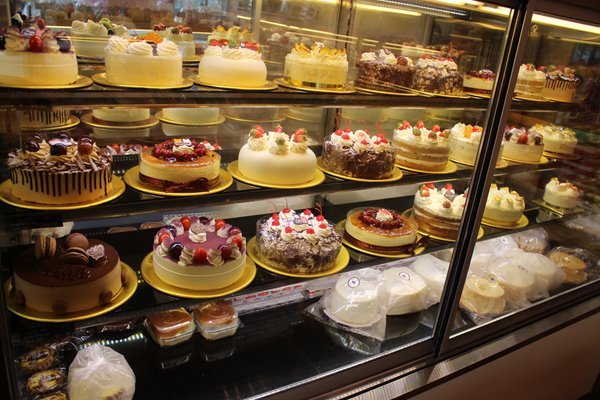 한쪽면에는 유리냉장실에 깔끔하게 진열되어있는 케익들이