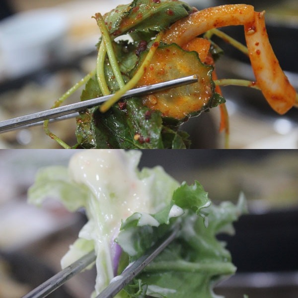 다시 석갈비로 돌아와서 쌈을 크게 쌓아서 한입~