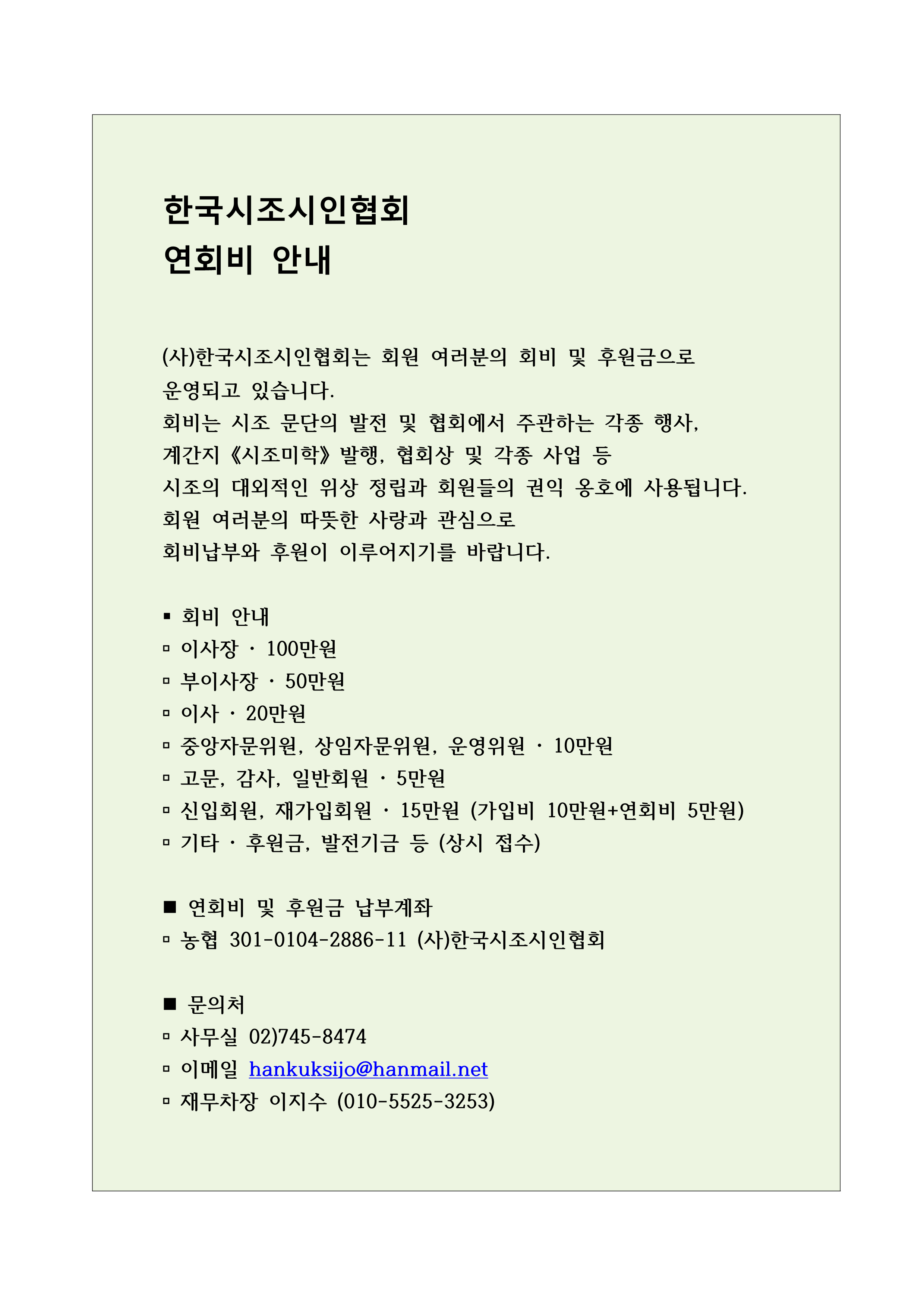[[알림]]연회비 안내 (농협 301-0104-2886-11) 작성자김영주|작성시간24.05.14|조회수534 목록 댓글 0 글자크기 작게가 글자크기 크게가 연회비 안내 및 협회 계좌번호 알려드립니다. 농협 301-0104-2886-11 (사)한국시조시인협회 다음검색 현재 게시글 추가 기능 열기 북마크 공유하기 신고 센터로 신고 댓글 댓글 0 댓글쓰기 답글쓰기 댓글 리스트