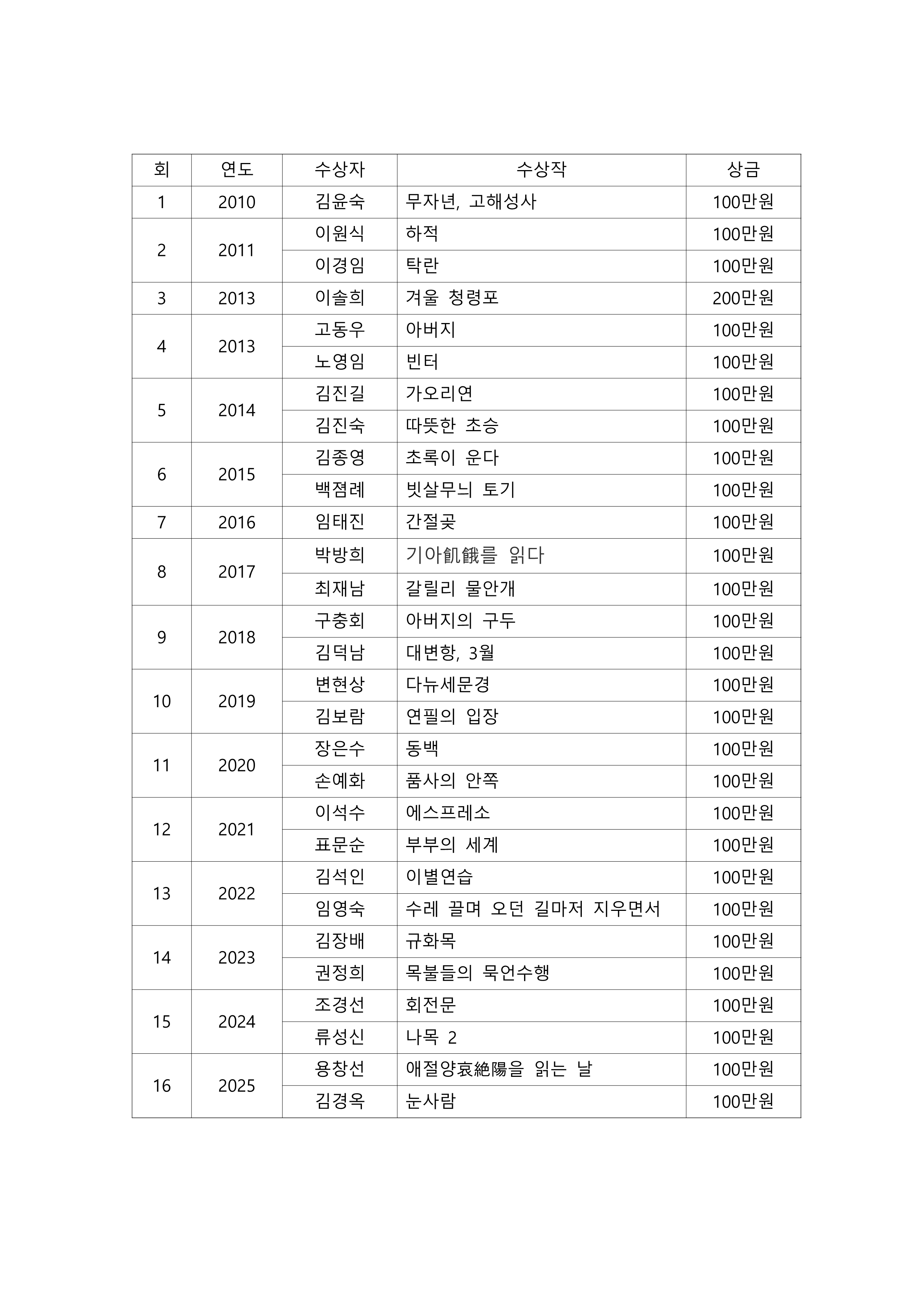 역대 한국시조시인협회상 신인상 수상자 작성자김영주|작성시간25.02.05|조회수217 목록 댓글 0 글자크기 작게가 글자크기 크게가 다음검색 현재 게시글 추가 기능 열기 북마크 공유하기 신고 센터로 신고 댓글 댓글 0 댓글쓰기 답글쓰기 댓글 리스트