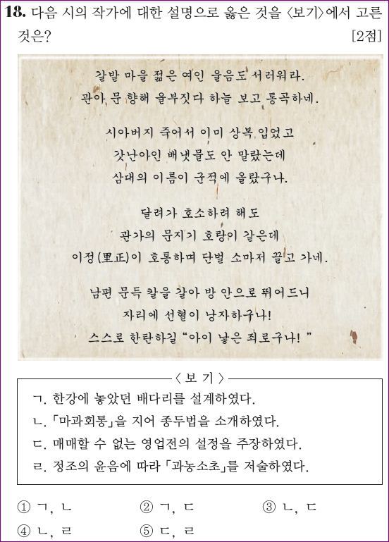 제시된 시는 수능을 비롯한 시험에 자주 나왔던 정약용의 애절양(哀絶陽)입니다.