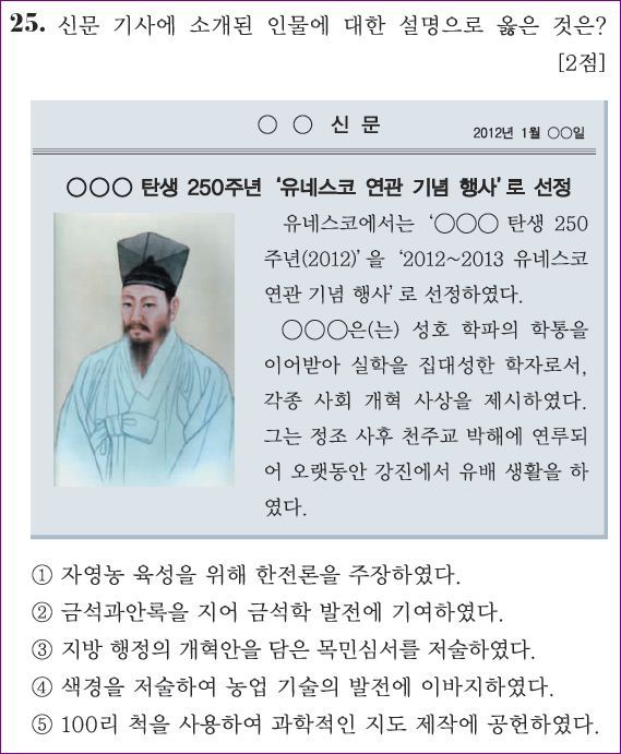 이익, 정약용, 박제가, 홍대용에 대한 문제가 출제되었는데, 그중 정약용 관련 문제가 제일 많이 출제됩니다.