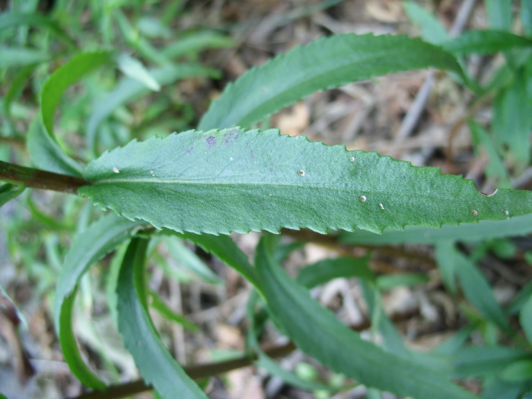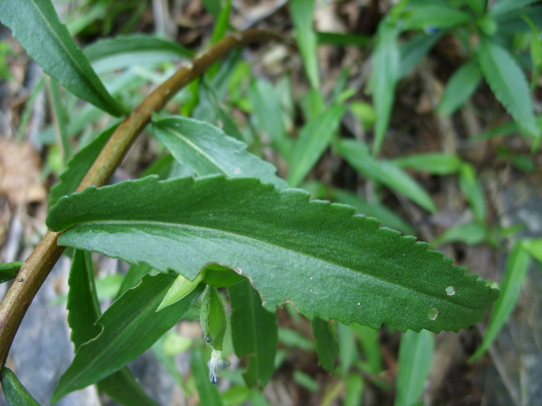 잎은 호생하고 도란형 또는 넓은 도피침형이며, 끝은 둥글고 기부는 좁아져서 줄기에 붙는다. 잎의 길이는 2~4cm, 폭은 1~2cm 정도로 잎의 양면에 털이 없고, 가에는 둔한 거치가 있다.