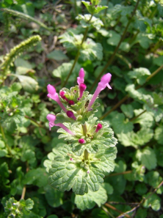 줄기는 높이가 30cm 정도이며, 온몸에 짧은 털이 나 있고, 줄기는 모나며 곧게 선다. 잎은 마주나고 심장 모양이며, 5~6월에 입술모양의 자주색 꽃이 이삭 모양의 총상(總狀) 꽃차례로 핀다. 어린 식물은 식용하며 산이나 들의 숲가에 나는데, 강원·경기·제주 등지에 분포한다. 열매가 골무 모양.