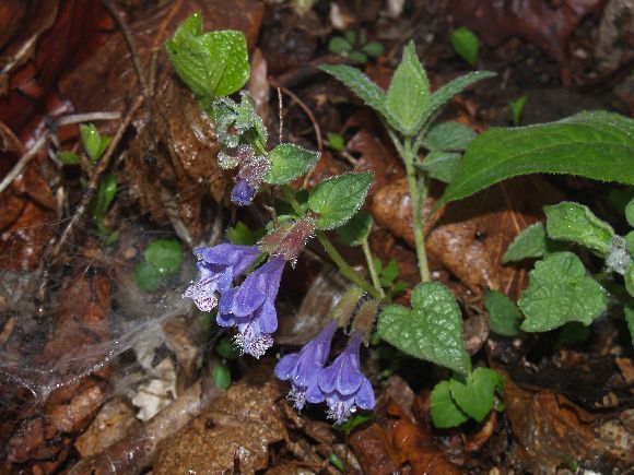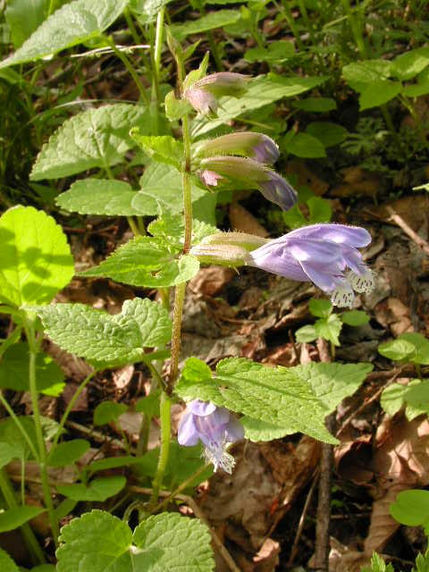 잎은 마주나고 잎자루가 있으며 달걀 모양 심장형이고 가장자리에 둔한 톱니가 있다. 덩굴의 잎은 좀더 커서 길이 10cm에 이른다. 꽃은 5월에 자줏빛으로 피고 윗부분의 잎겨드랑이에서 나와서 한쪽에 2∼6개 달린다.