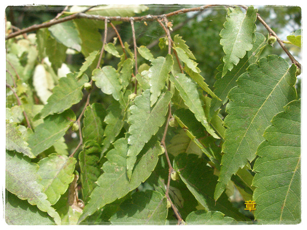 느티나무 잎사귀는 까끌까끌한 편이고 규칙적인 톱니가 주욱 늘어서 있다.