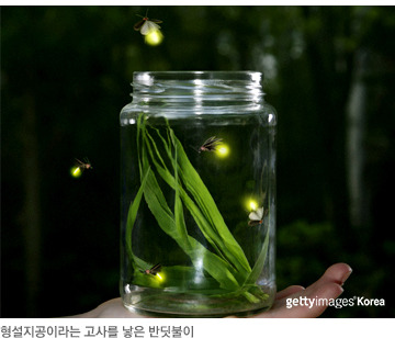 심해어나 일부 버섯과 미생물, 반딧불이는 예사롭지 않게도 몸에서 빛을 내니, 이들 발광생물은 ‘빛(光)으로 말(言)’을 한다. 벌은 몸을 흔들어서, 매미나 개구리는 소리로, 나방이들은 냄새로, 파리나 모기는 날개의 떪(진동)으로, 박쥐는 초음파로 의사소통을 하는데 말이지. 하여 암수가 깜빡깜빡 빛으로 알리고 알아낸다. |