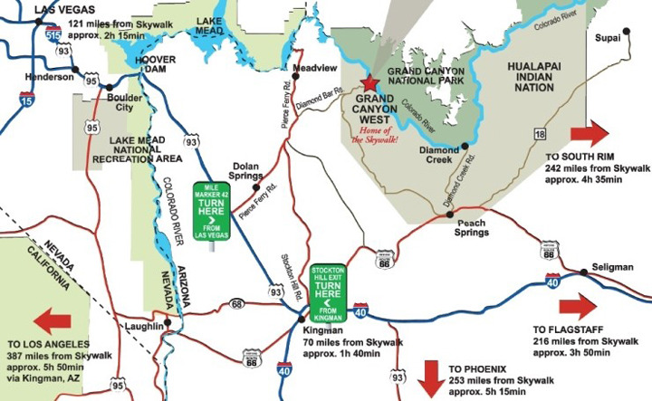 실제로, 라스베가스에서 그랜드캐년 웨스트림 까지의 직선 거리는 약 80KM로 고속도로로 약 40분 소요 거리 밖에 되지 않는데 도로가 우회하도록 굽어 있어서 약 200KM 를 이동하셔야 하지만 아마도 많은 분들이 일부러라도 직선으로 가지않고 사막의 여러 구경거리를 관광할 수 있도록 일부러라도 우회하도록 요청하실 것으로 생각되는 아주 이상적인 관광코스 입니다.