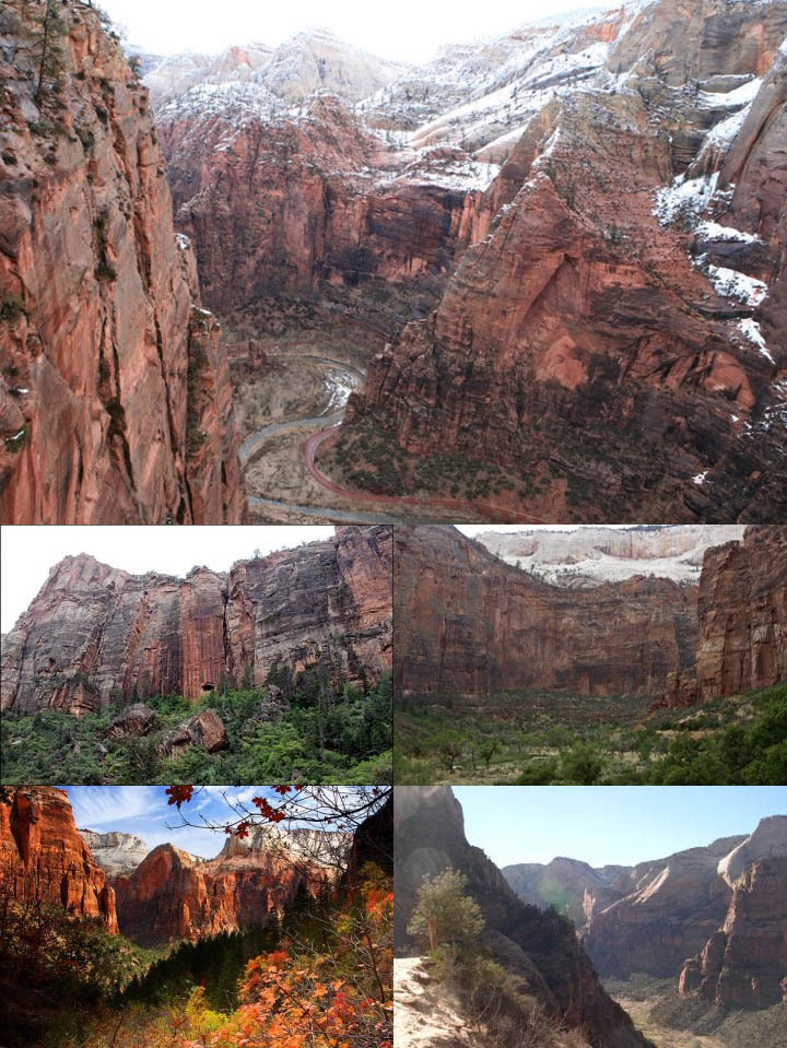 수백 미터 높이로 솟아 올라 도열한 듯 서있는 장대한 바위산과 그 사이로 난 계곡을 내려보노라면, 사람이 아닌 신들이 사는 세계에 온 듯한 느낌마저 듭니다. 일찍이이 지역을 개척한 몰몬교도들의 영향으로 “예루살렘” 혹은 “돌아갈 약속의 땅”을 의미하는 성경적인 이름 자이언 ( 시온 )이라는 이름을 얻게 됐습니다.오래 전 이 지역에 살았던 원주민들이 남긴 자취와 사막의 계곡 지역이 가진 놀랄 만큼 풍부한 생태계가 특히 인상적인 곳입니다.
