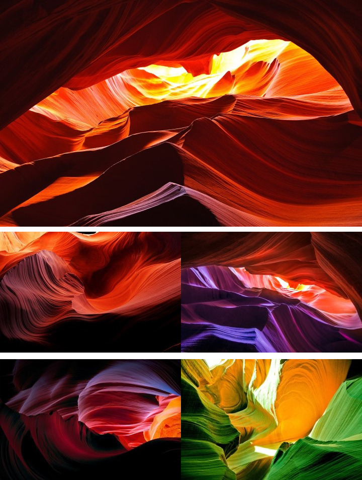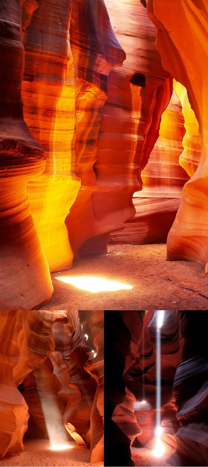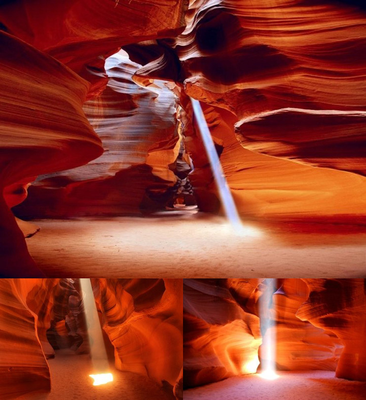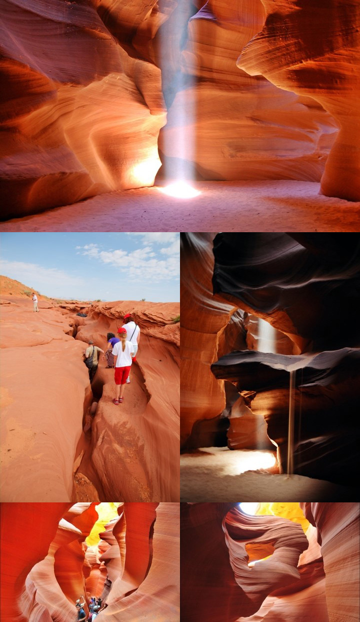 이곳은 붉은 사암으로 깔린 평지의 사막인데 수만년 동안 빗물이 바위사이로 스며들면서 바위를 교묘하게 깍아서 굴곡을 이룬곳인데 중간중간 위로 구명이 나 있어 빛이 그 안으로 들어와서 현란한 빛의 예술품을 만들어 낸 것입니다.