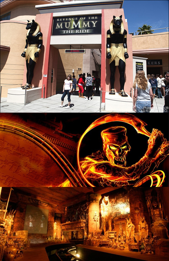 유니버셜사 가 2004년5월 5천만불을 투자해 도입한 세계최초의 Psychological Roller Coaster 인데, 음향, 조명 등을 이용해 " 미이라의복수 " 영화를 컨셉으로 한 43초의 짧은 시간대에 공포감을 극대화한것으로 암흑속에서 앞뒤로 마구 움직이는 최초의 심리 스릴 라이드를 타면서 등골 오싹한 스릴을 만끽할 수 있습니다.위험하지는 않지만 노약자나 임산부는 타지 않은 것이 좋습니다