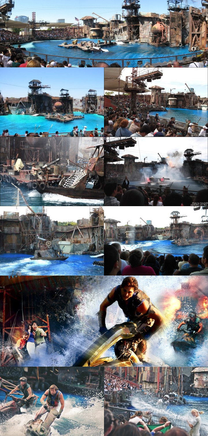 케빈코스터너 가 주연한 영화 워터월드 를 스턴트맨이 실제 재현하는 액션으로 가득한 모험 쇼로 약25분 진행됩니다. 수상기지를 재현한 거대한 세트와 처절한 전투 장면은영화에서 본 그대로 입니다.해양보트와 수상스키가 맹스피드로 활주하는 경이로운 스턴트 쇼와 함께 불기둥이치솟고, 물보라가 일대를 뒤덮는 호쾌한 장관이 전개됩니다. 그리고놀라운 클라이맥스! 하이테크 특수효과와 파이로 테크닉을 구사한 연출은 박력 만점 입니다. (앞 좌석은 물이 튀기니 감안하셔야 합니다.)