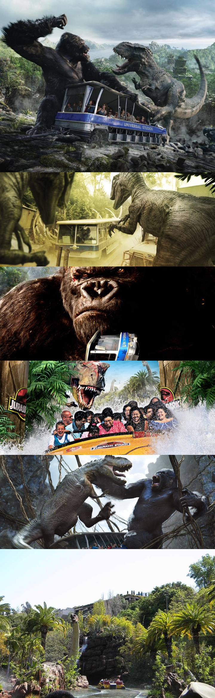 영화를 능가하는 박진감을 주는 최신 어트랙션으로, 1996년에개장된 이 어트랙션은 리버 래프팅으로 원시 숲을 헤치고 들어가면서 시작됩니다. 어트랙션이 시작되면 영화 <주라기 공원>에서 보았던 공룡이 날뜁니다. 3층 건물 높이에 해당하는 길이의 12m짜리 울트라 사우루스가 보이고배고픈 15m높이의 T-Rex가 먹이를 찾아 울부짖읍니다. 굶주린 공룡들 사이에서 빠져 나갈 수 있는 유일한 탈출구는 25m의절벽같은 폭포로 떨어지는 길밖에는 없습니다.