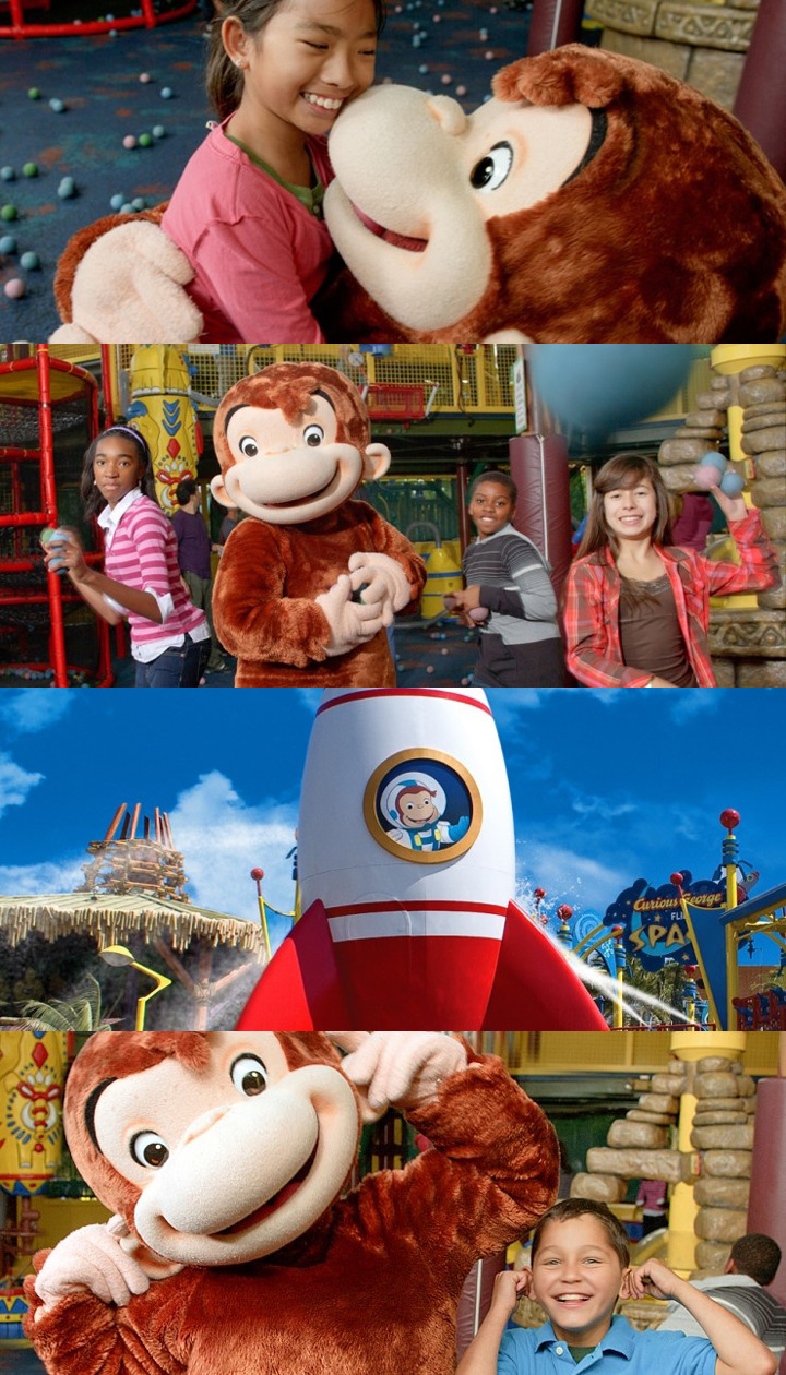 Curious George 와익살 넘치는 시간을 보내세요. 또한 어린이용 놀이터에서 5백갤런(약 1900리터)의물이 단번에 쏟아지는 스릴과 수천 개의 비눗방울을 뿜어 내는 즐거움울 만끽하세요. 어린 시절이 단숨에되살아납니다.