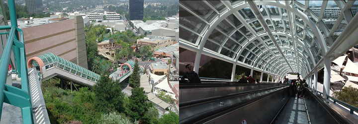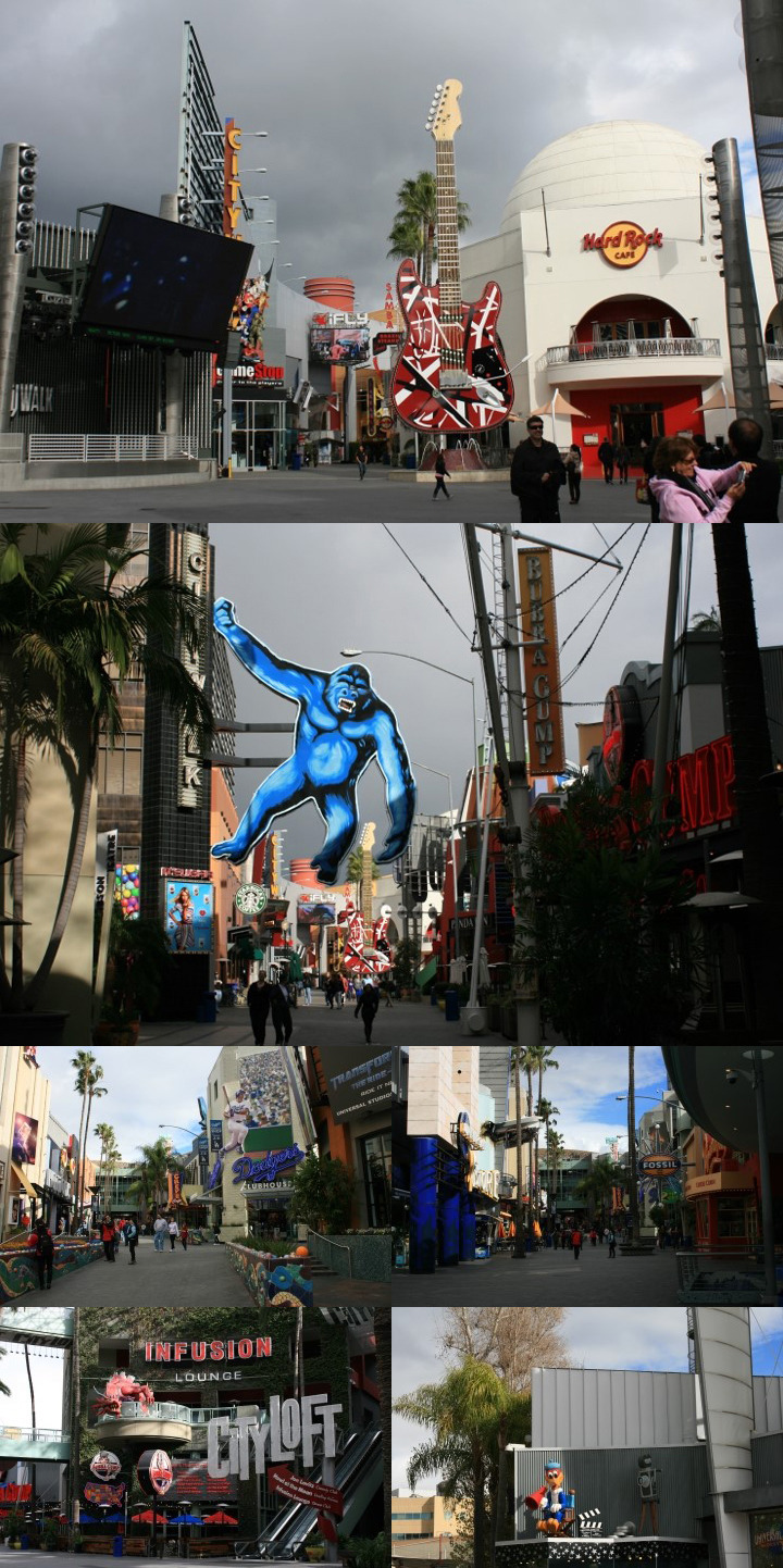 유니버셜스튜디오 의 정문으로 가는 길에는 로스엔젤레스에서 가장 널리 알려진 레스토랑, 쇼핑, 엔터테인먼트 지역인 유니버셜시티워크 ( Universal City Walk )가 위치합니다. 이 유니버셜시티워크 에는 각종 위락시설, 클럽, 대형 영화관 등 볼거리와 놀거리가 풍성하여 밤낮으로 관광객의 발걸음이 끊이지 않는 곳입니다. 특히 주말엔 최첨단 야외 무대에서 라이브 콘서트가 열려 로스엔젤레스 최고의 나이트 라이프를 선사합니다.