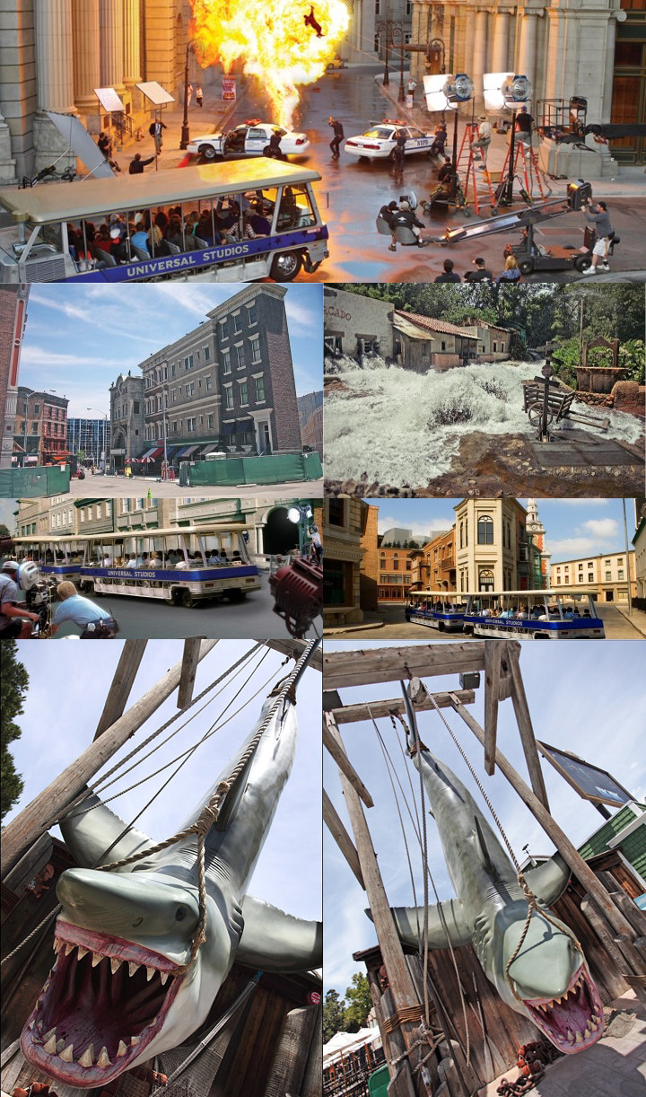 할리우드 역사상 최대인 16,000제곱미터(4,840평)의역사적인 스튜디오 세트 거리를 새롭게 제작한 13개 도시 블록을 보며 영화 제작의 과정을 알아볼 수 있습니다. 재판소 광장, 뉴욕의 브로드웨이나 멕시코풍의 무대, 킹콩과 조스, 대홍수와 대지진 등의 생생한 영화 세트를 지나다 보면흥분과 스릴을 만끽하게 됩니다. 특수촬영 현장을 견학하여, 영화에이용된 특수효과 체험과 그 비밀을 알 수 있습니다.