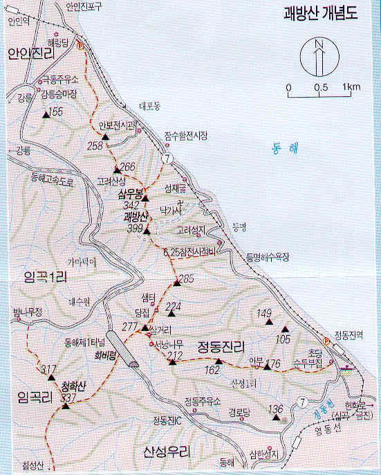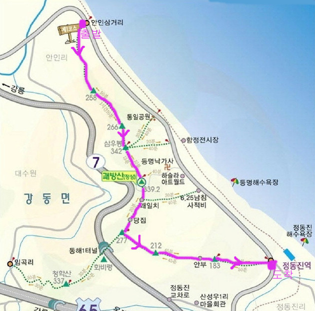 대포동 ~> 북쪽 아인지닐 삼거리 ~> 괘방산 산성 ~> 괘방산 ~> 당집 ~> 정동진역