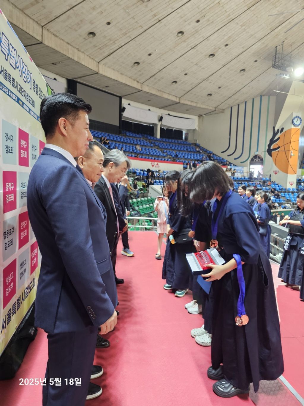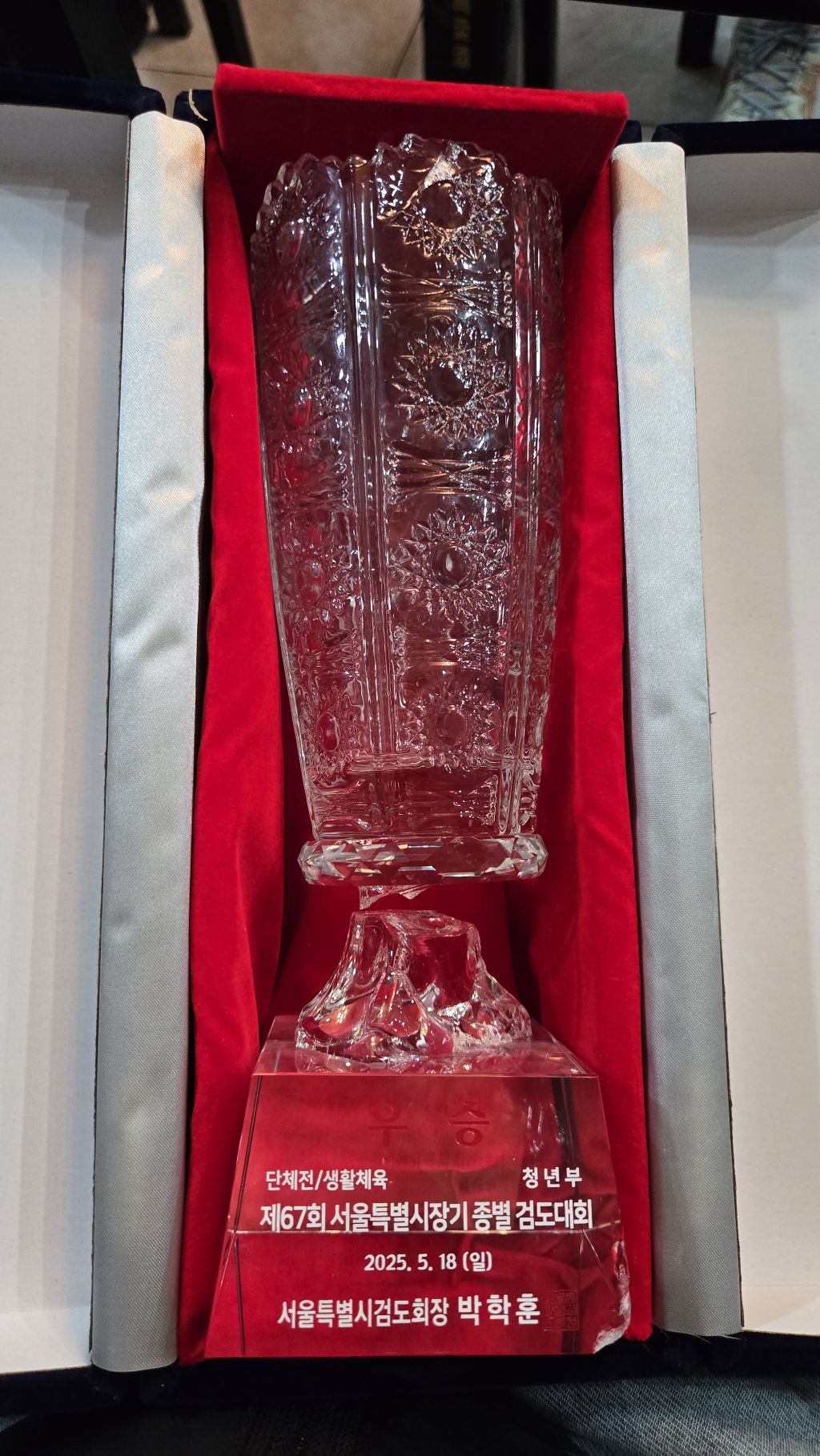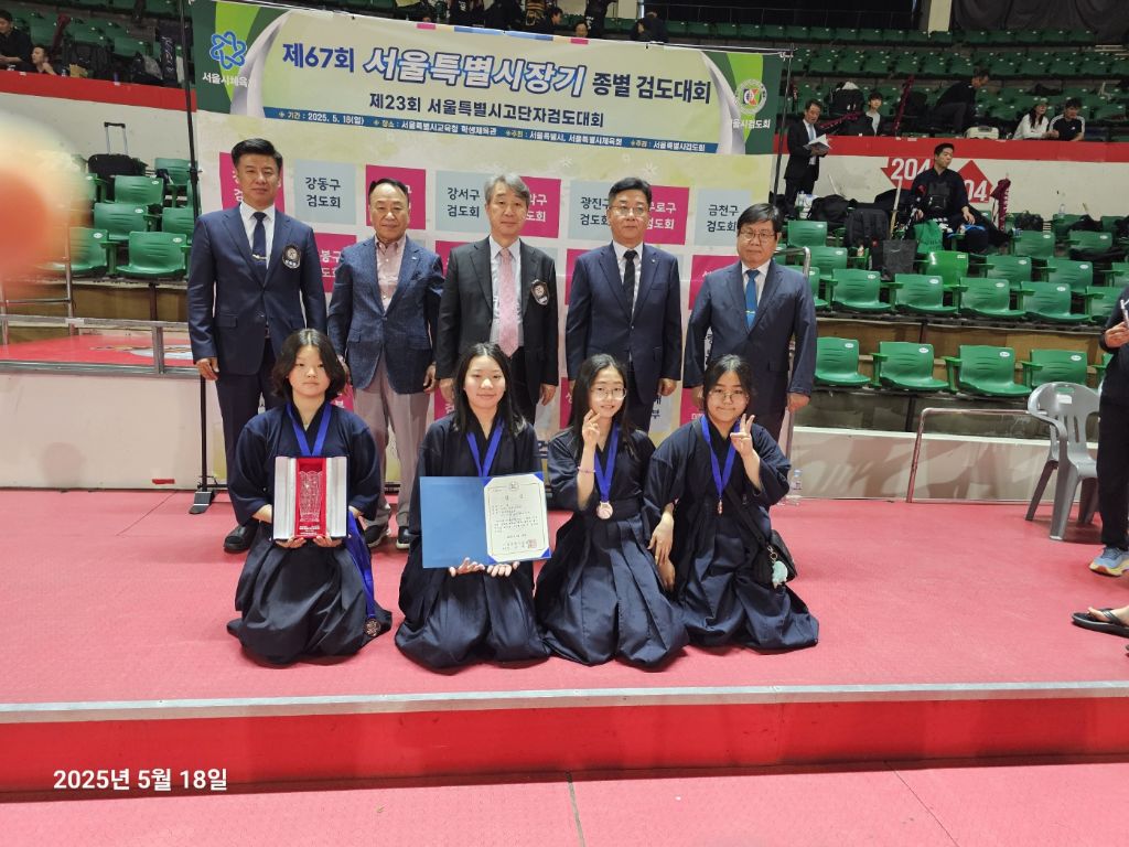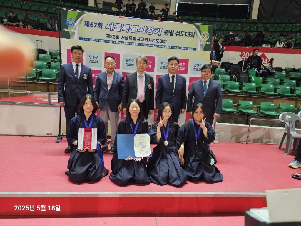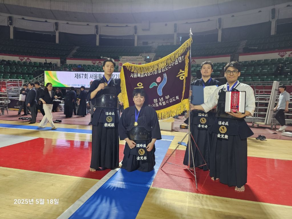 25년 서울시장기 검도대회 출전하여 청년부 우승(배성민,김태혁,박주용,김태훈,홍성윤) 여중부 3위(유아미,강나현,유한비,금민서) 차지 하였습니다