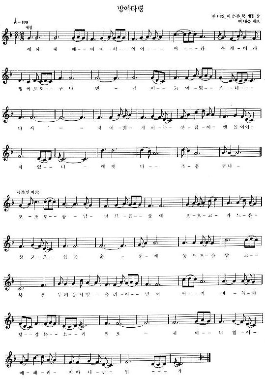 1 초저녘 방애는 찔마안 해도 새벽에 방애는 나는 못 찧겄네 (후렴) 어허~엉 어허엉 어허엉 어허엉 어허야 얼럴럴 거느리고 방해 흥애가 논다 2 일년에 열두달 놈의 집을 살아서 청초마 밑에다 다 떨어 넣네 3 영감에 흥감에 떡받아 먹게 방애품을 팔어다가 재개떡을 했네