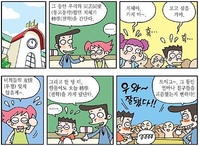 [[사자성어]]同苦同樂(동고동락) 작성자于天|작성시간07.05.01|조회수439 목록 댓글 0 글자크기 작게가 글자크기 크게가 [사자성어]同苦同樂(동고동락) [풀이] 괴로움과 즐거움을 같이함. 동고동락 하다. [English] ―하다 share one´s joys and sorrows 《with》: share the pleasures and pains of life 《with》 同 [훈음] 한가지, 화할 동 [난이도] 7급 [부수] (입구) [획수] 총 6획 ( 부수 3획) [활용] 强弱不同 (강약부동) 車同軌 (거동궤) 堅白同異 (견백동이) 苦 [훈음] 괴로울, 쓸 고 [난이도] 6급 [부수] 艹 (초두) [획수] 총 9획 ( 부수 4획) [활용] 刻苦 (각고) 覺苦 (각고) 刻苦勉勵 (각고면려) 同 [훈음] 한가지, 화할 동 [난이도] 7급 [부수] (입구) [획수] 총 6획 ( 부수 3획) [활용] 强弱不同 (강약부동) 車同軌 (거동궤) 堅白同異 (견백동이) 樂 [훈음] 즐길, 편안할 락 [난이도] 6급 [부수] (나무목) [획수] 총 15획 ( 부수 4획) [활용] 歌樂 (가악) 間奏樂 (간주악) 康樂 (강락) 출처:엠파스한자사전.NAVER한자사전. [만화로 깨치는 한자]同苦同樂(동고동락) ·轉學(전학) : 다니던 학교에서 다른 학교로 학적을 옮겨 가서 배움.·友情(우정) : 친구 사이의 정.·轉(구를·굴러옮길 전), 學(배울 학), 友(벗 우), 情(뜻 정) 출처:경향신문. 제공:재능한자 다음검색 현재 게시글 추가 기능 열기 북마크 공유하기 신고 센터로 신고 댓글 댓글 0 댓글쓰기 답글쓰기 댓글 리스트