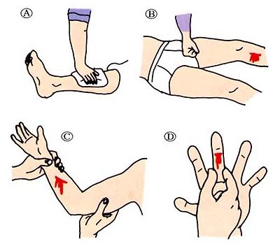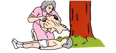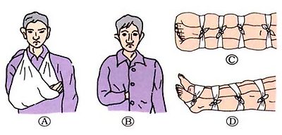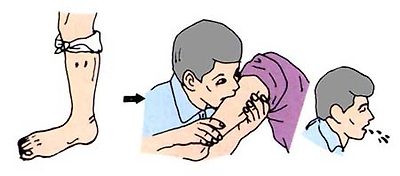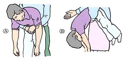 동상일 때 ●심장마사지실시 ①흉골의 중간점에 두손을 포개어 올려 놓는다. ②두 팔꿈치를 뻗어 흉골이 4-5㎝쯤 들어가도록 누른다. ③1분간에 60회의 비율로 반복실시한다. (구급요원이 올때까지) *심폐소생법실시 인공호흡 2회, 심장마사지 15회의 비율로 실시하여 생명유지 더위로 쓰러졌을 때(일사병) ①물을 다량 마시고 손가락을 넣어 위속이 완전히 비도록 토한다. ②토한 것이나 남은 음식은 비닐봉지에 담아 전문인에게 보인다 허리를 삐었을 때 ⒜삼각건을 이용하여 교정시킨다. ⒝옷 사이에 골절된 손을 넣는다. ⒞방석등을 감아 고정시킨다. ⒟두 다리를 함께 묶어 고정시킨다 목에 이물이 걸렸을 때 ●출혈시 지혈법 ⒜압박지혈법: 상처 부위에 헝겁등을 대고 출혈이 멎을때까지 세게 누른다. ⒝다리에 출혈시 대퇴동맥을 누른다. ⒞팔에 출혈시 상완동맥을 누른다. ⒟손가락에 출혈시 손가락 양 옆을 누른다 임신중 하혈 ①독이 심장으로 가지못하도록 정맥이 압박될 정도로 묶는다. ②되도록 빨리 상처부위에서 독소를 빨아내어 뱉는다. ![]() |