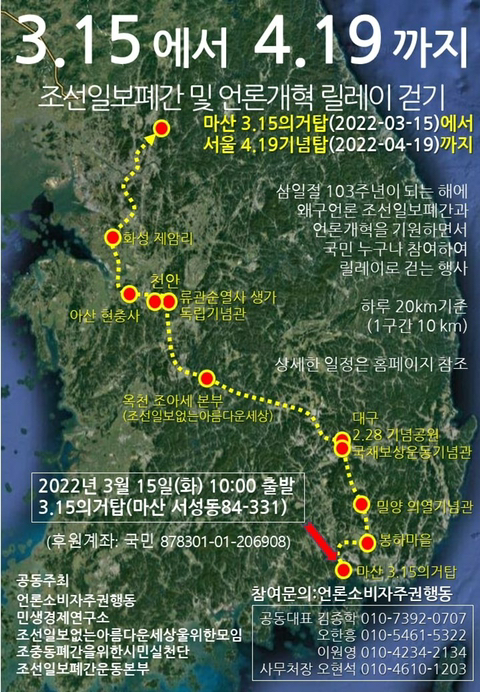 9:00 언소주/ 조선일보 폐간,언론개혁을 위한 국토 순례/3.15~4.19 마산3.15탑~서울4.19탑/16일 창원역 출발~봉잠성당~봉하마을
