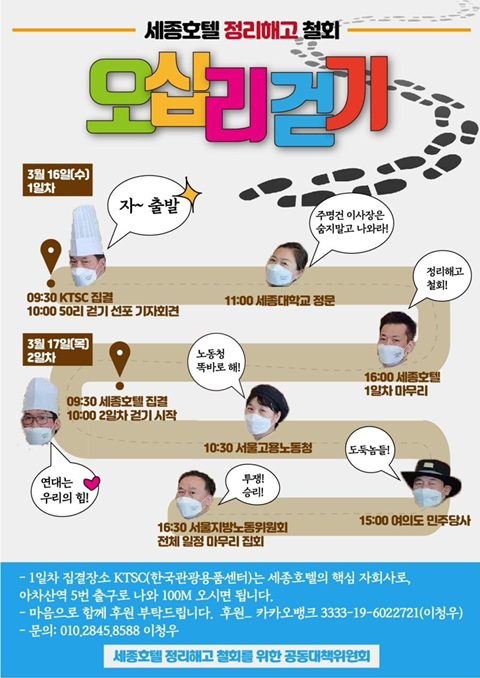 *세종호텔 정리해고 철회 오십리 걷기' 3.16~3.17 KTSC~세종대학교~세종호텔~서울고용노동청~여의도 민주당사~서울지방노동위원회