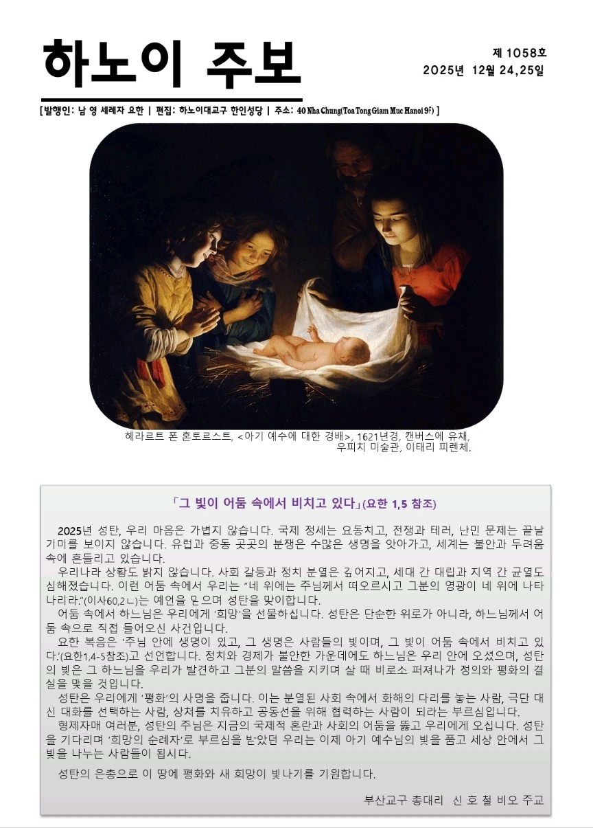 주님성탄대축일 밤미사/낮미사(25.12.24/25) 하노이 주보 작성자홍보분과 김율리아^^|작성시간25.12.24|조회수74 목록 댓글 0 글자크기 작게가 글자크기 크게가 다음검색 현재 게시글 추가 기능 열기 북마크 신고 센터로 신고 댓글 댓글 0 댓글쓰기 답글쓰기 댓글 리스트