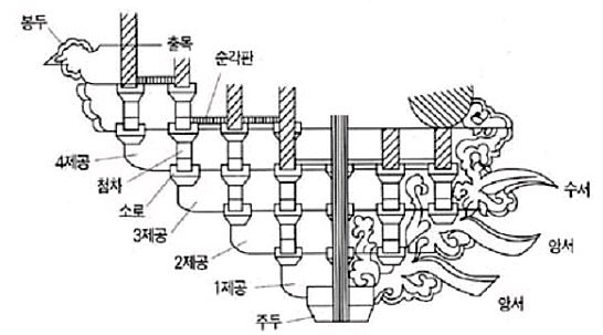 * 보방향의 첨차는 쇠서형을 따르고 내부는 교두형이나 운궁형태이다.