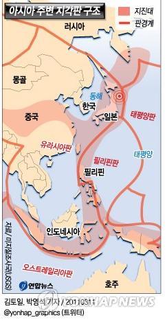 위 그림에서 보이듯이 황해평원의 중국쪽은 지진대 많습니다.