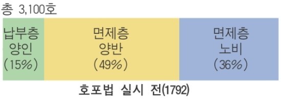 조선후기 막바지에 들어서는 상공업과 농업의 발달로 평민 중에 부를 축적한 이들이 돈을 내고 양반신분을 얻기도 했다. 그 수가 상당해서 양반들은 면세, 면역의 특권이 있어 국가 재정이 엉망이었다. 그래서 흥선대원군은 기존의 균역법을 폐지하고 호포제로 바꿔 실시했다. 즉 선무군관 개념도 사라지고 양반등 모든 계층에게 년 포 한 필씩을 세금으로 내게 했던 것이 호포법이다.