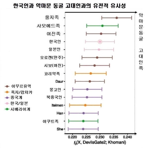 현대 한국인과 유전적 변이가 가장 닮은 약 8000년 전 신석기 시대 고대인의 게놈(유전체) 분석 연구 결과가 세계 최초로 공개됐다. 한국인의 조상과 유전적으로 거의 유사한 고대인이 규명된 것이다. UNIST 게놈연구소와 영국·러시아·독일 등 국제 공동연구팀은 두만강 위쪽 러시아 극동 지방의 ‘악마문 동굴’에서 발견된 7700년 전 동아시아인 게놈을 해독하고 슈퍼컴으로 분석한 결과를 1일(현지시간) 국제 학술지 ‘사이언스 어드밴시스(Science Advances)’에 발표했다. 악마문 동굴(사진)은 한국 역사에서 고구려, 동부여, 북옥저가 자리잡았던 지역에 위치하고 있다. 이 동굴에서는 신석기 시대 유물이 발견됐으며 아시아에서는 가장 오래 된 직물이 발견된 곳으로도 유명하다. 1973년 동굴이 발굴된 이후 탄소 동위원소 분석을 통해 7700년 전 신석기 시대 사람으로 판명된 여러 명의 뼈가 발견됐다. 고고학자와 생물학자, 게놈 분석 연구자들로 구성된 국제 연구진은 악마문 동굴인 5명의 뼈를 확보하고 뼈에서 추출된 DNA를 이용해 유전체 해독을 시도했다. 이 중에서 7700년 전 것으로 연대측정된 20대와 40대 여성의 머리뼈에서 나온 게놈 정보를 분석했다. 연구진의 분석 결과 악마문 동굴인은 한국인처럼 갈색 눈과 삽 모양 앞니 유전자를 지닌 수렵채취인으로 밝혀졌다. 또 우유 소화를 못하는 유전 변이와 고혈압에 약한 유전자, 몸 냄새가 적은 유전자 등 현대 동아시아인들의 전형적인 유전 특성도 있었다. 연구진은 악마문 동굴인과 다른 고대인, 현대 한국인의 게놈 정보를 비교 분석했다. 그 결과 악마문 동굴인은 악마문 동굴 인근에 있는 원주민을 제외하면 현대인 중에서는 한국인과 가까운 게놈 정보를 가진 것으로 판명됐다. 특히 모계를 통해 유전되는 미토콘드리아 게놈이 한국인의 미토콘드리아 게놈과 유사한 것으로 밝혀졌다. ▲ 연구에 활용된 악마문 동굴인 두개골 사진./UNIST 제공 게놈 분석 연구 실무책임자인 전성원 UNIST 게놈연구소 연구원은 “미토콘드리아 게놈 종류가 같다는 것은 모계가 같다는 것을 의미한다”며 “악마문 동굴인과 현대 한국인의 오랜 시간 차이를 고려해도 매우 가까운 편으로 악마문 동굴인은 한국인의 조상과 거의 같다고 볼 수 있다”고 밝혔다. 연구진은 또 악마문 동굴인과 현재 아시아의 수십 인족(ethnic group)들의 게놈 변이 정보를 비교해 현대 한국인의 민족 기원과 구성 계산을 시도했다. 그 결과 악마문 동굴에 살았던 고대인들과 현대 베트남 및 대만에 고립된 원주민의 게놈을 융합할 경우 한국의 게놈이 가장 잘 표현됐다. 한국인의 뿌리는 수천 년 동안 북방계와 남방계 아시아인이 융합하면서 구성됐다는 사실을 방대한 게놈 변이 정보로 규명한 것이다. 하지만 현대 한국인의 실제 유전적 구성은 남방계 아시아인에 훨씬 가깝다. 이에 대해 연구진은 “수렵채집이나 유목을 하던 북방계 민족보다 정착농업을 하는 남방계 민족이 더 많은 후손을 낳고 빠르게 확장했기 때문으로 보인다”며 “이번 악마문 동굴인 게놈 분석 결과와 결합하면 한반도에서는 북·남방계 혼합이 일어났지만 현재 유전적 구성은 대부분 남방계라는 큰 그림이 완성되는 것”이라고 밝혔다. 연구를 이끈 박종화 UNIST 게놈연구소장은 “이번 연구 결과 한국인을 포함한 동아시아인은 단일민족이라고 불러도 좋을 만큼 다른 인족보다 유전적 동일성이 매우 높았다”며 “중국의 한족과 한국, 일본을 아우르는 거대한 인구집단의 유전적 동일성이 큰 것은 농업기술 등을 통한 문명 발달로 이들 집단이 급격히 팽창했음을 보여주는 것”이라고 설명했다.