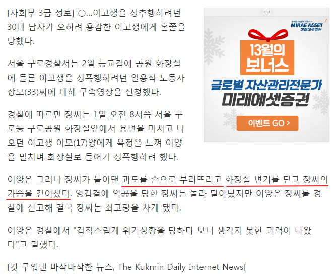 작성자아쿠아마린마고성 작성시간 15.12.21 사람이 너무 절박하면 초인적인 힘이 나옵니다...근데 저 여고생 뭔 운동을 평상시에 좀 한것 같군요...남자라도 갑자기 누가 칼을 들이대면 움찔하는데