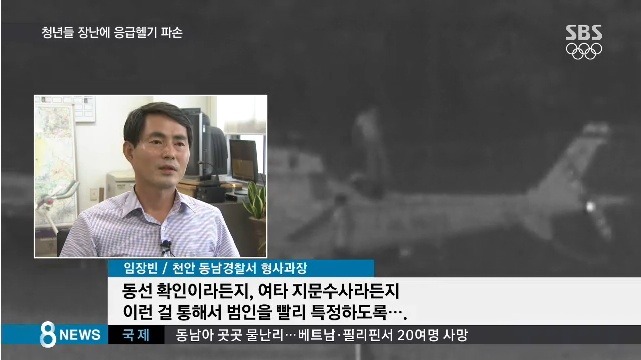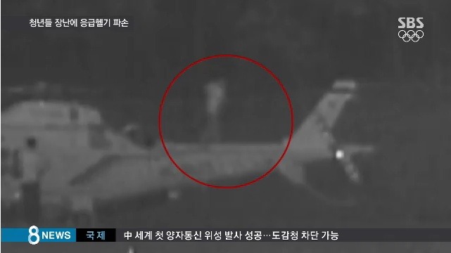 경찰은 CCTV를 통해 10대 후반에서 20대 초반의 남성 3명이 술을 마시고 헬기 위에서 장난을 치고 달아난 것으로 보고 이들을 쫓고 있습니다.