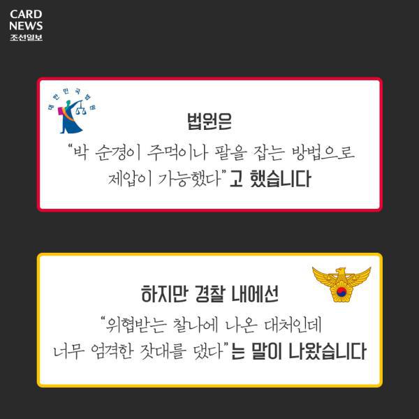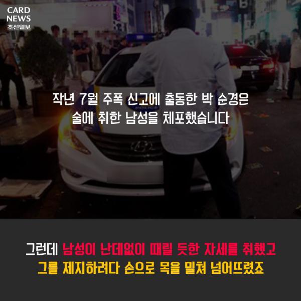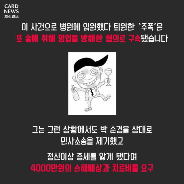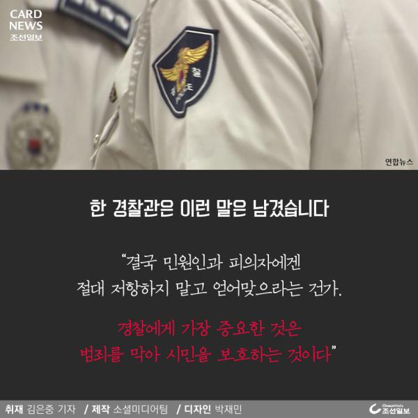 작성자구리구리1344 작성시간 17.08.24 개인적으로 안타까운 일임에는 틀림 없고 주폭이 문제라는건 확실하지만 그걸 공권력이 무너진다 너무 비약하는 것 아닌지. 조선일보... 박사모들이 주장하던 군, 경이 데모대(촛불집회) 쓸어버려야 한다고 주장하던 사건이 겹쳐지면서 왠지 찝찝해지는 뉴스군요.