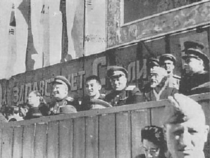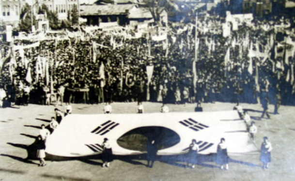 ◆ 1945년평양에서 열린 소련군 환영 행사 (맨 왼쪽에 태극기)