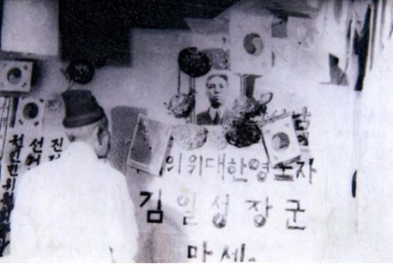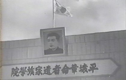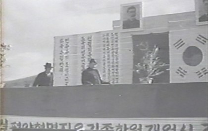 평양혁명자유가족학원 개원식에 참석 중인 김일성과 태극기