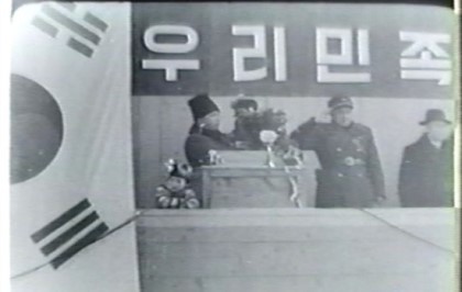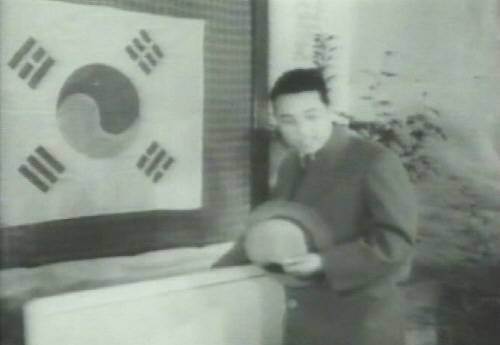 뒤에는 한반도 지도와 양쪽에는 태극기가 걸려 있다.