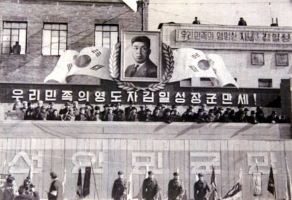 광복후 한해가 지났지만 이때까지만 해도 붉은기는 없고 태극기가 걸려 있다. 소련의 지지를 받으며 등장한 김일성도 초기에는 태극기를 사용했다.