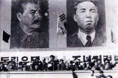 김일성과 스탈린 사진 뒤에는 소련기와 태극기가 보인다.