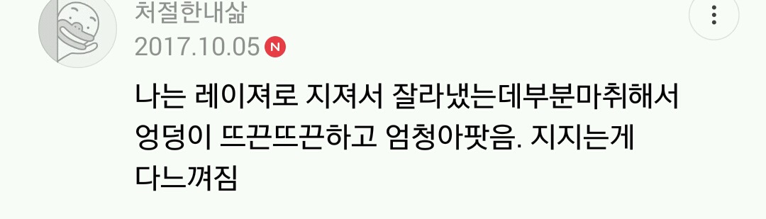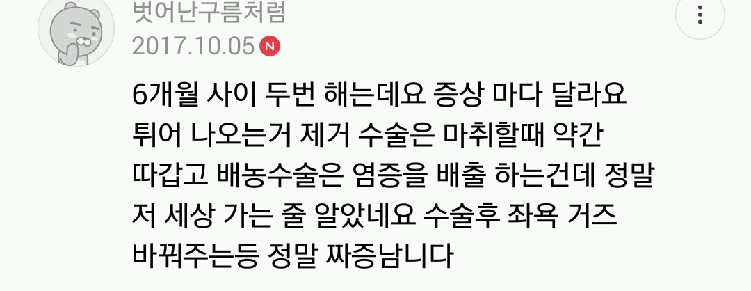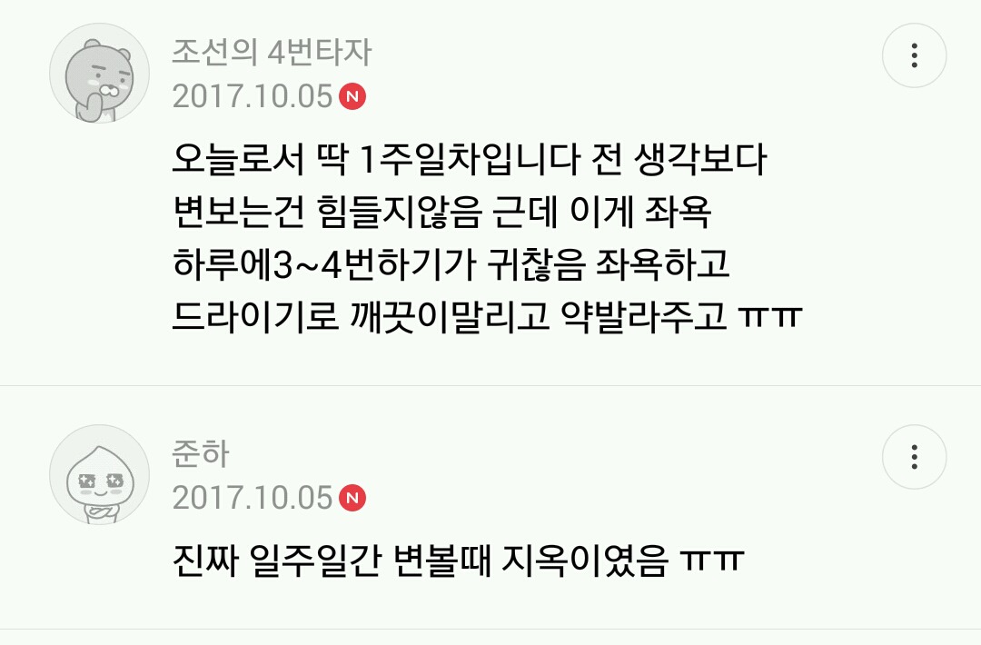 아침마다 화장실에서 지옥을 맛보다 혼자 찾아간 항문외과의 기억.... 아직도 생생함... 수술하고 나서 며칠 똥 눌 때 쓰리긴 하지만 바로 좌욕 하면 풀리고... 그렇게 며칠 더 지나면