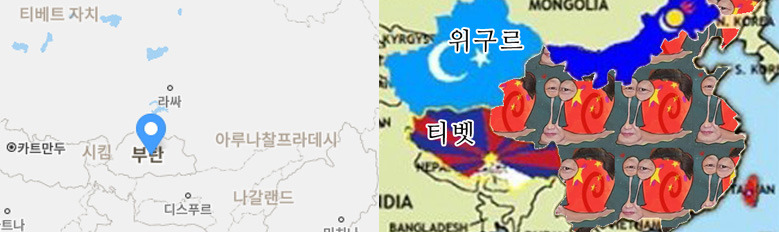 부탄이 형님국가로 모시던 티베트가 중국에 강제병합된 이후 중국의 침입을 막기 위해 골수 반중국가가 되었다.
