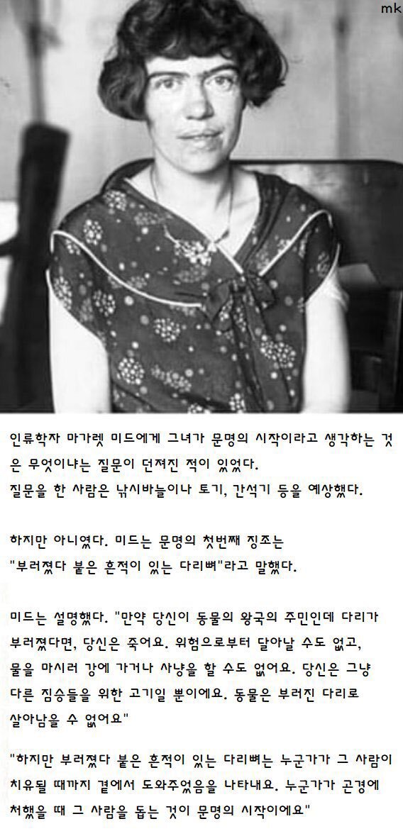 몇 년 전, 인류학자 마가렛 미드는 한 학생에게서 '문명의 첫 증거는 무엇인가?'라는 질문을 받았다. 그 학생이 기대한 것은 토기, 사냥 도구, 숫돌 혹은 종교적 유물을 미드가 말할 것이라 예상했다.