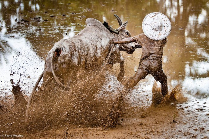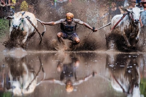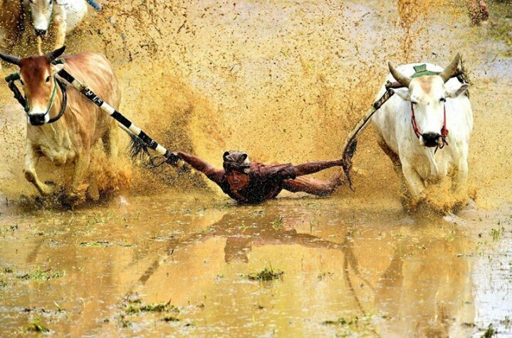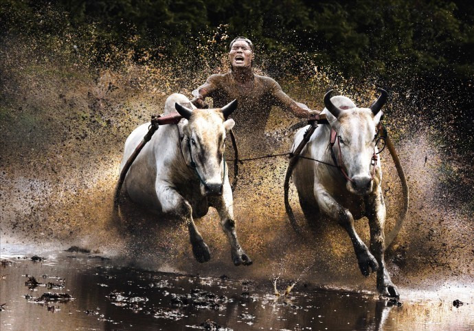 대나무 쟁기에 올라탄 한 남성이 황소 두 마리와 함께 열띤 레이스를 벌이고 있다. 곧 이 남성은 진흙탕인 논바닥으로 첨벙하며 고꾸라진다.